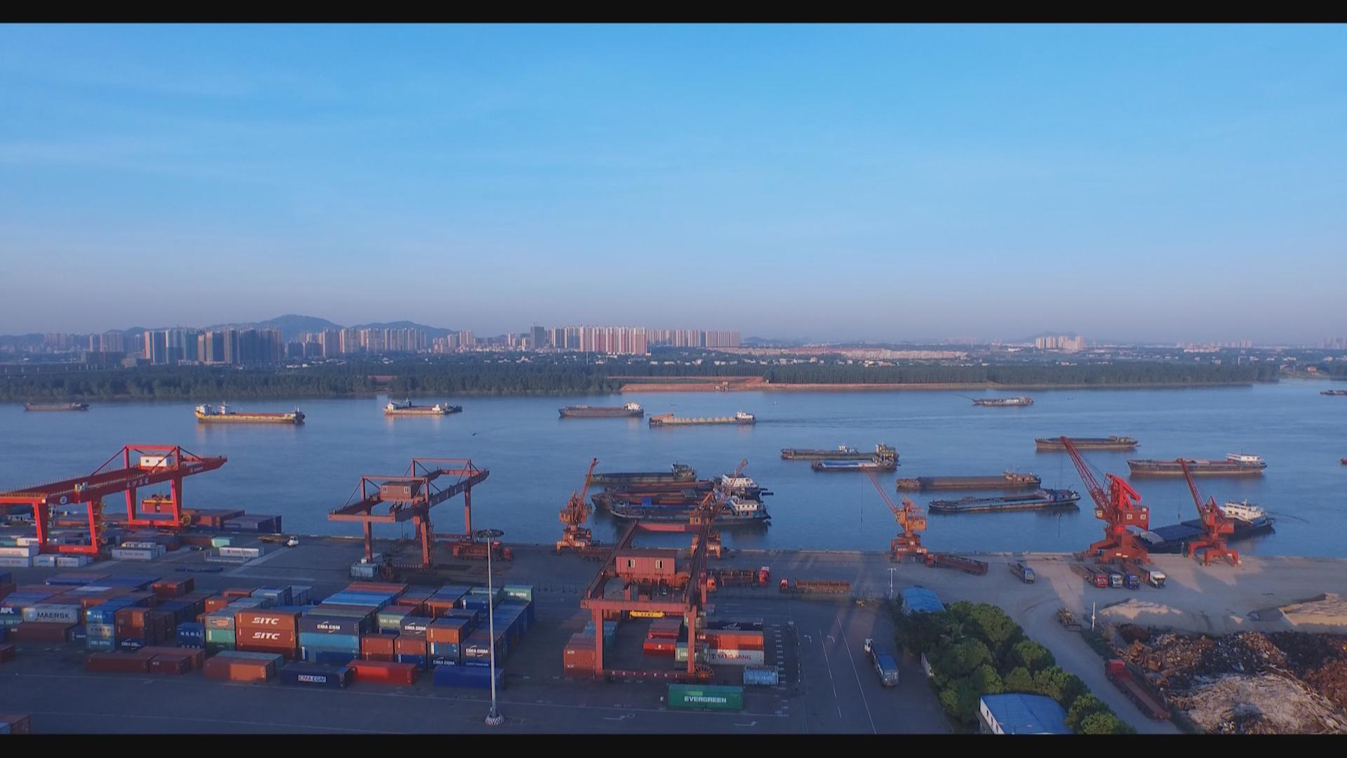 在岳陽城陵磯港,記者劉媛源介紹說:“為了更好地利用湖南良好的水運資源,長沙與岳陽打出了一套漂亮的組合拳。我現在所在的位置就是岳陽市的城陵磯新港,經過不到一天的航行,那批從長沙新港順流而下的貨物正在這里進行新一輪的裝卸,這些貨物將乘坐我身后更加重量級的貨輪,從這里啟程運往海外。”