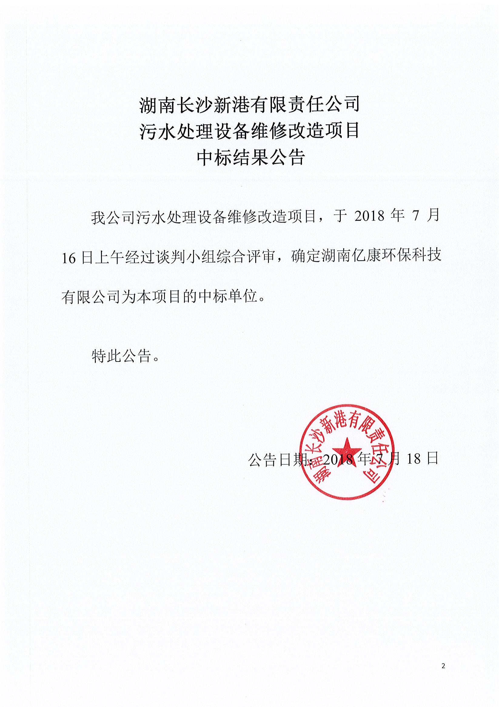 湖南長(zhǎng)沙新港有限責(zé)任公司 污水處理設(shè)備維修改造項(xiàng)目中標(biāo)結(jié)果公告