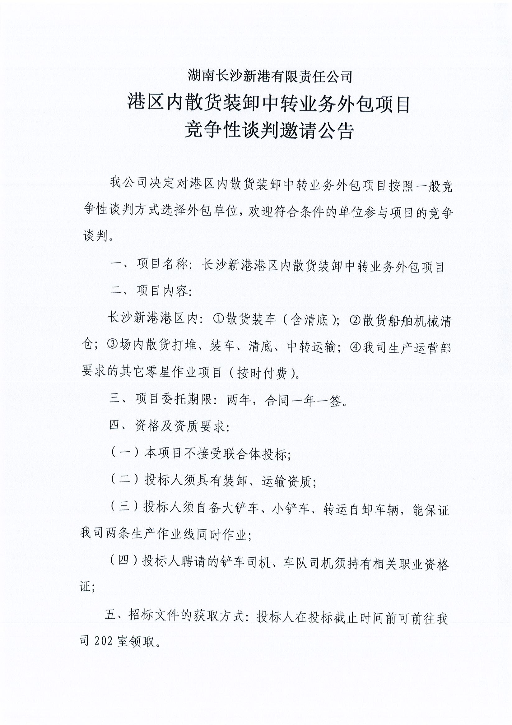 湖南長沙新港有限責(zé)任公司港區(qū)內(nèi)散貨裝卸中轉(zhuǎn)業(yè)務(wù)外包項目競爭性談判邀請公告