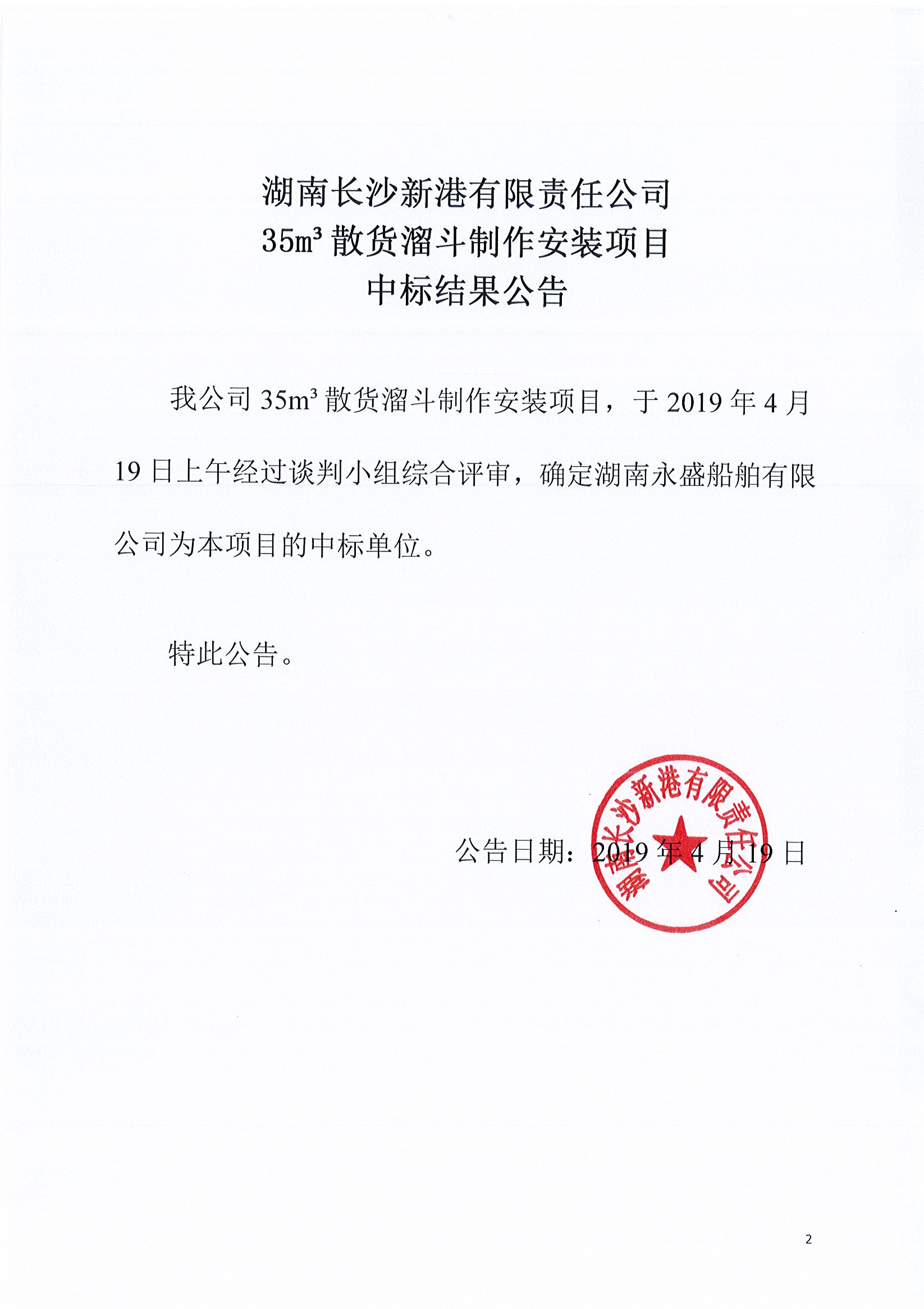 湖南長沙新港有限責(zé)任公司35m³散貨溜斗制作安裝項目中標(biāo)結(jié)果公告