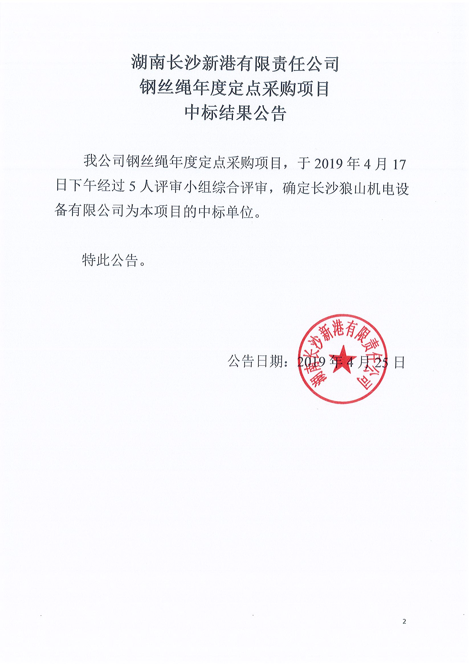 湖南長沙新港有限責任公司鋼絲繩年度定點采購項目中標結果公告