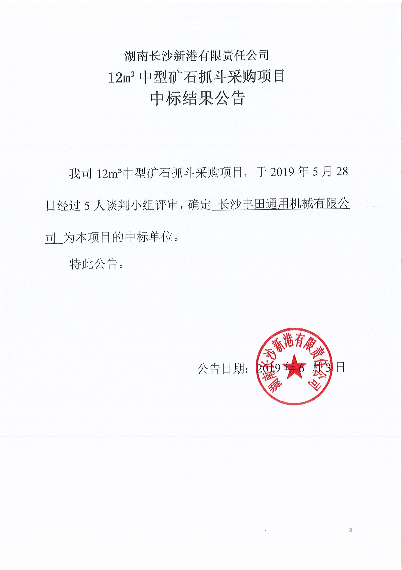 湖南長沙新港有限責任公司12m³中型礦石抓斗采購項目中標結果公示