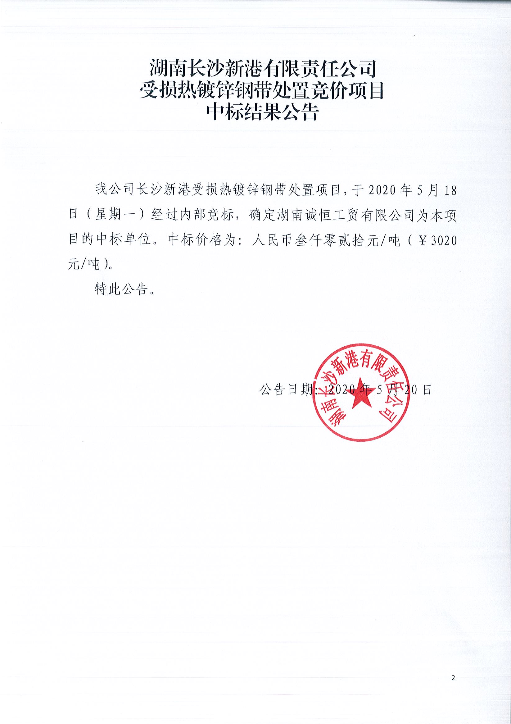 湖南長(zhǎng)沙新港有限責(zé)任公司受損熱鍍鋅鋼帶處置競(jìng)價(jià)項(xiàng)目中標(biāo)結(jié)果公告
