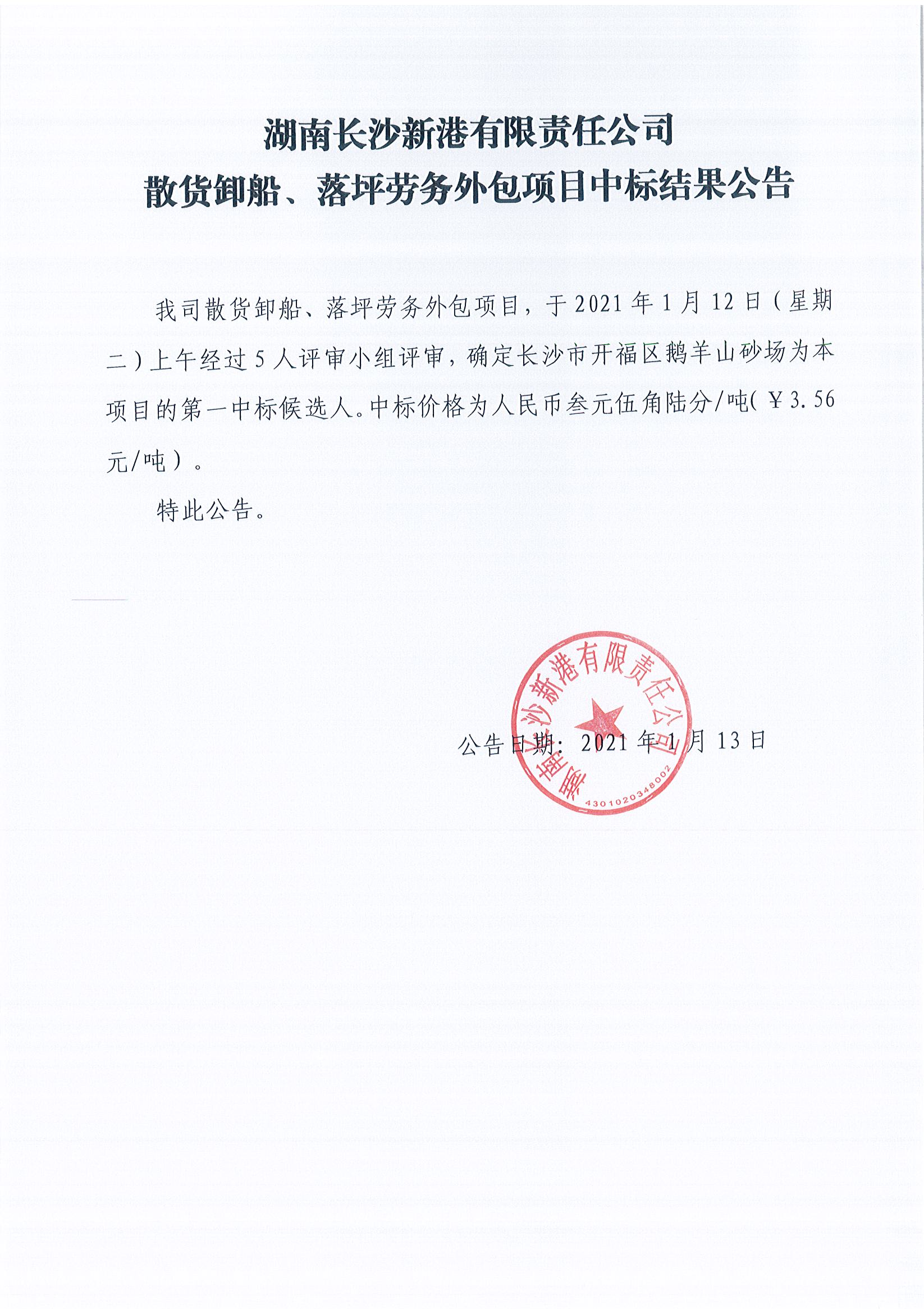 湖南長(zhǎng)沙新港有限責(zé)任公司散貨卸船、落坪勞務(wù)外包項(xiàng)目中中標(biāo)結(jié)果公示
