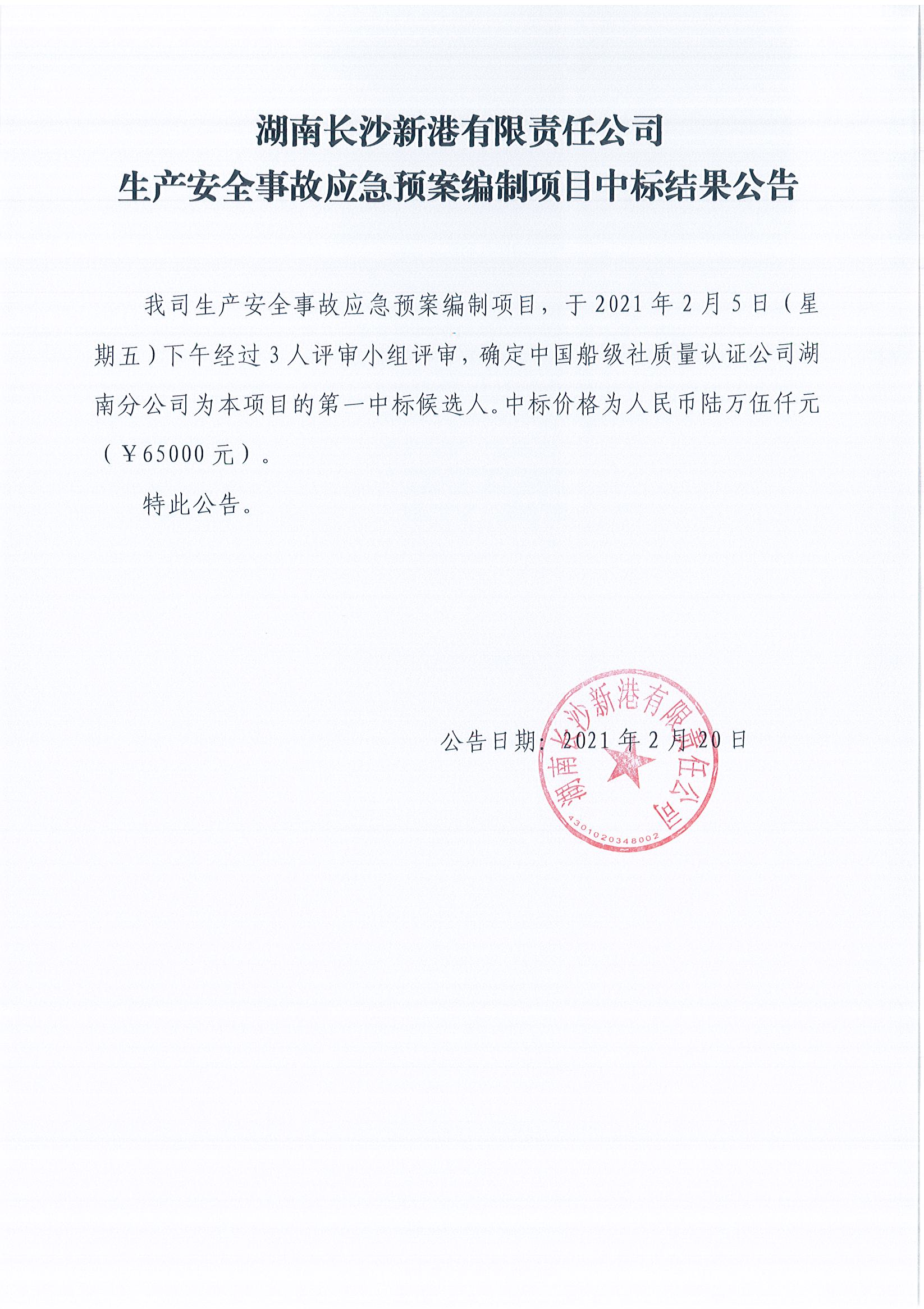 湖南長(zhǎng)沙新港有限責(zé)任公司生產(chǎn)安全事故應(yīng)急預(yù)案編制項(xiàng)目中標(biāo)結(jié)果公告
