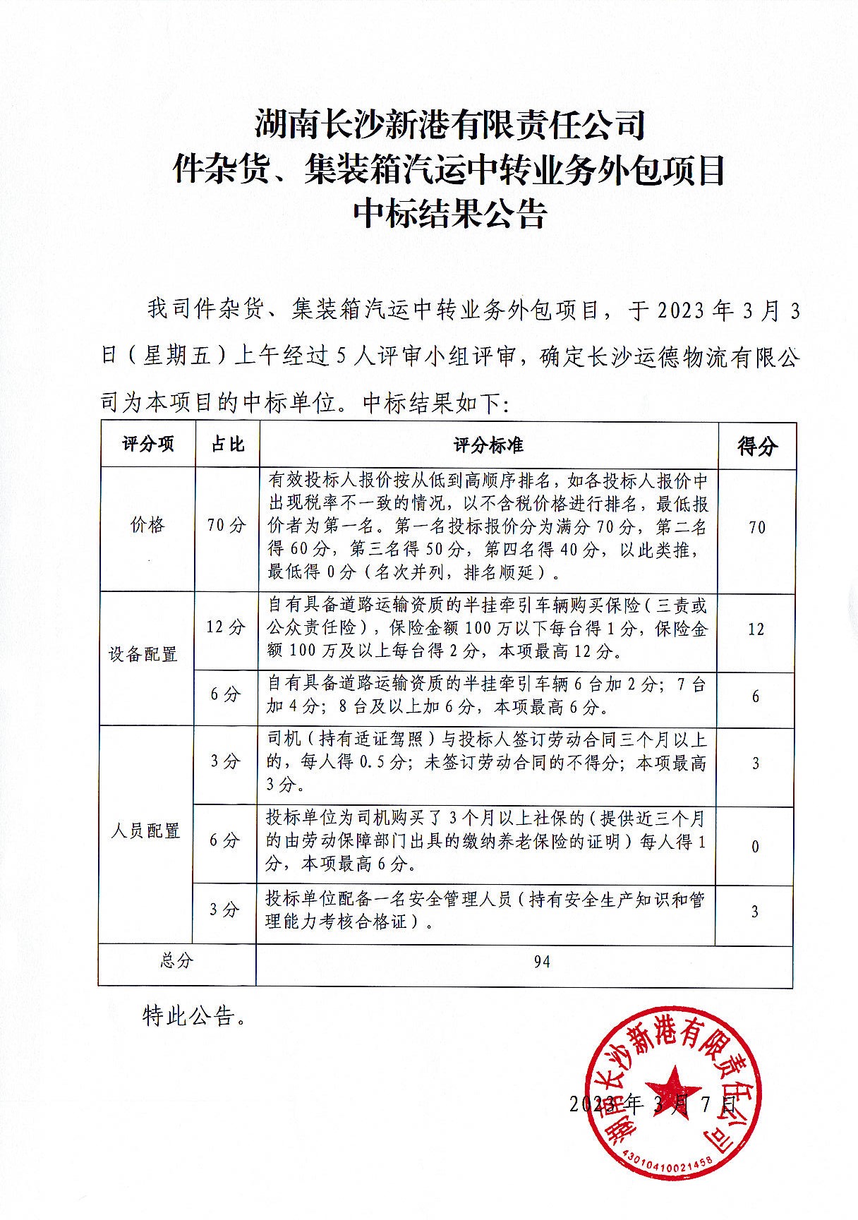 湖南長沙新港有限責任公司件雜貨、集裝箱汽運中轉業務外包項目中標結果公告