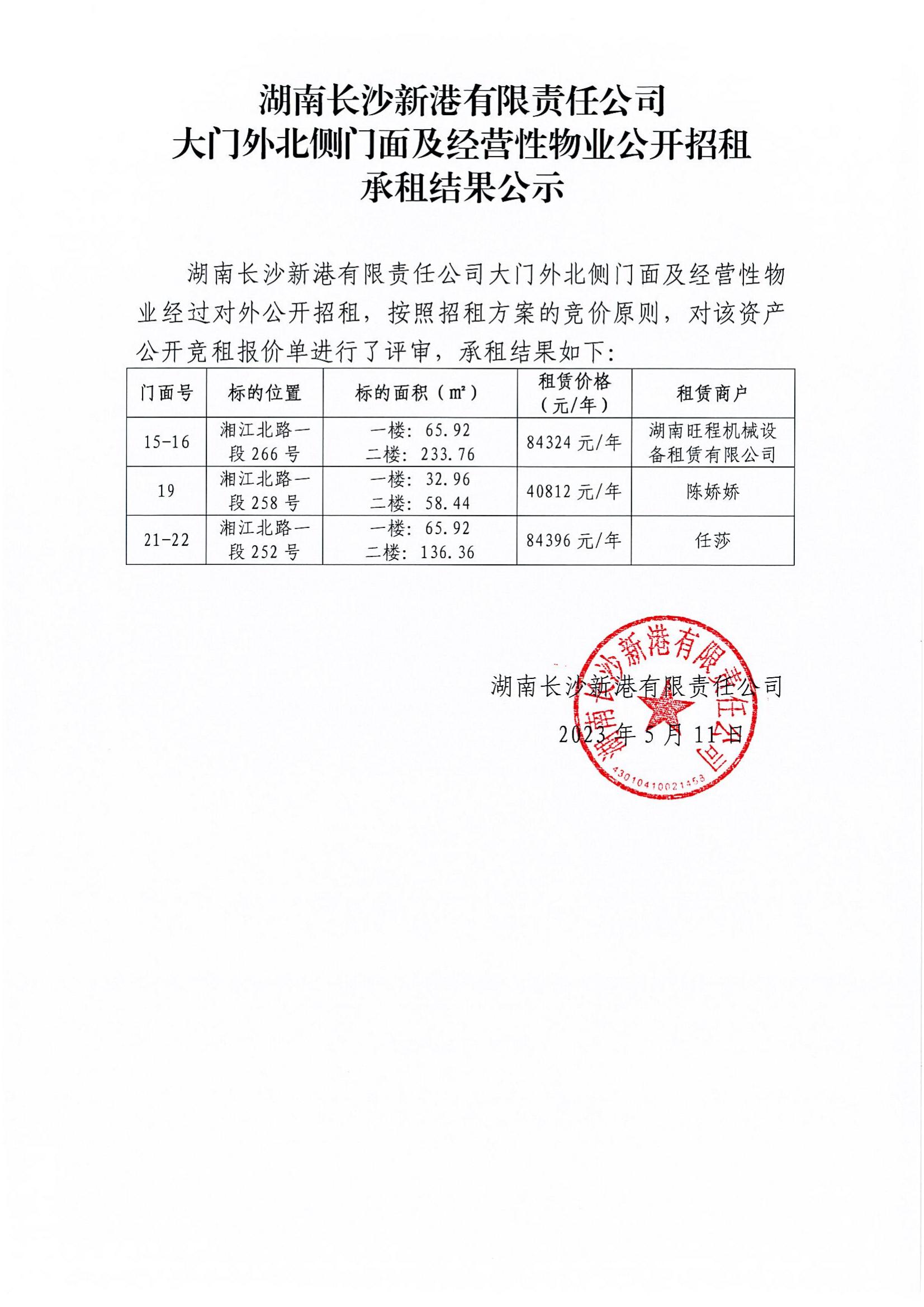 新港公司大門外北側門面及經營性物業公開招租承租結果公示