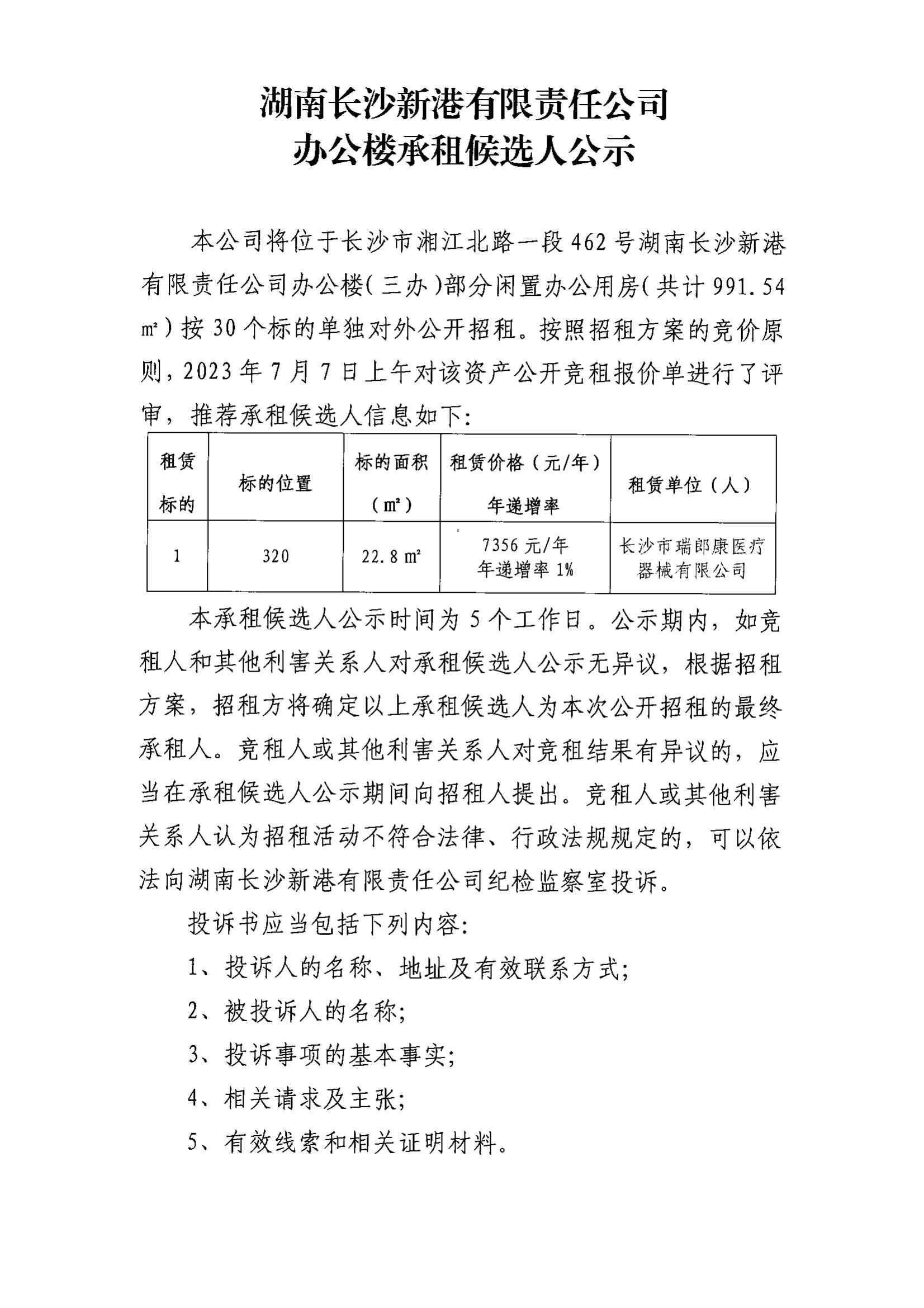 湖南長沙新港有限責任公司辦公樓承租候選人公示(320)