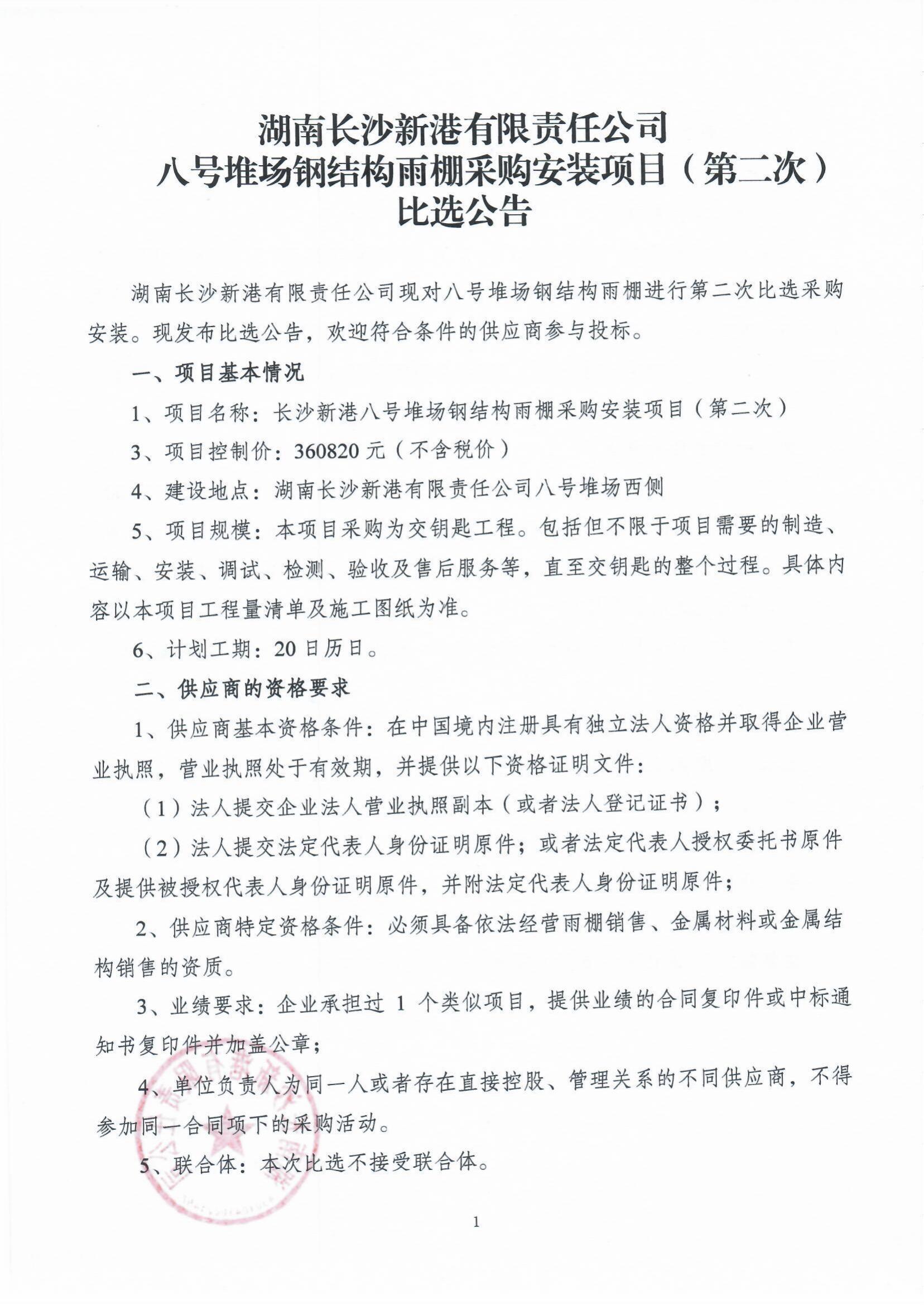 湖南長沙新港有限責任公司八號堆場鋼結構雨棚采購安裝項目(第二次)比選公告